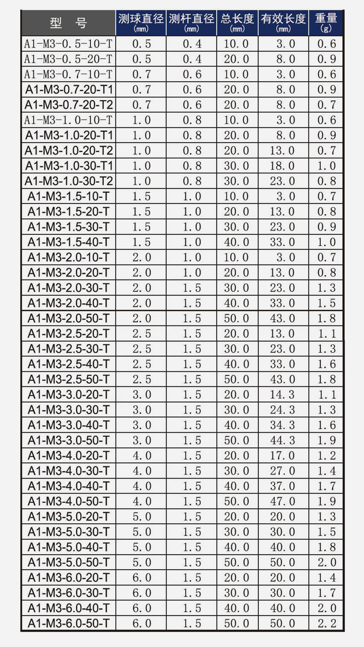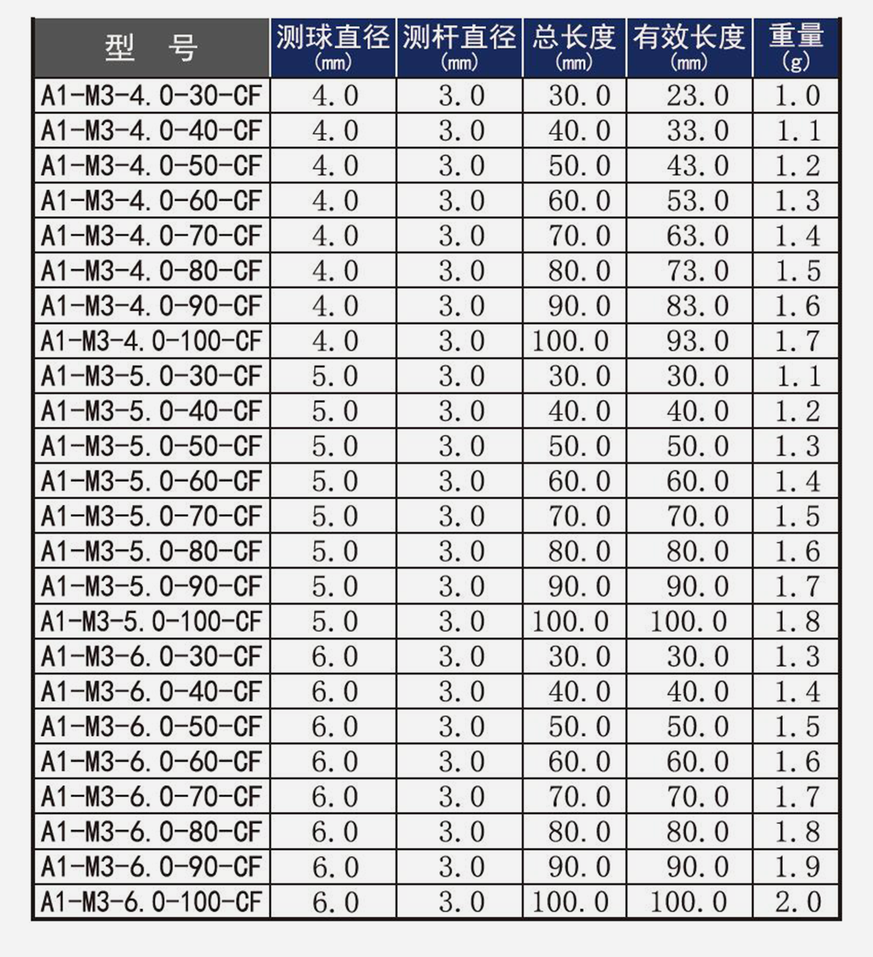 M2、M3、M4螺紋系列/碳纖維測桿/紅寶石測球