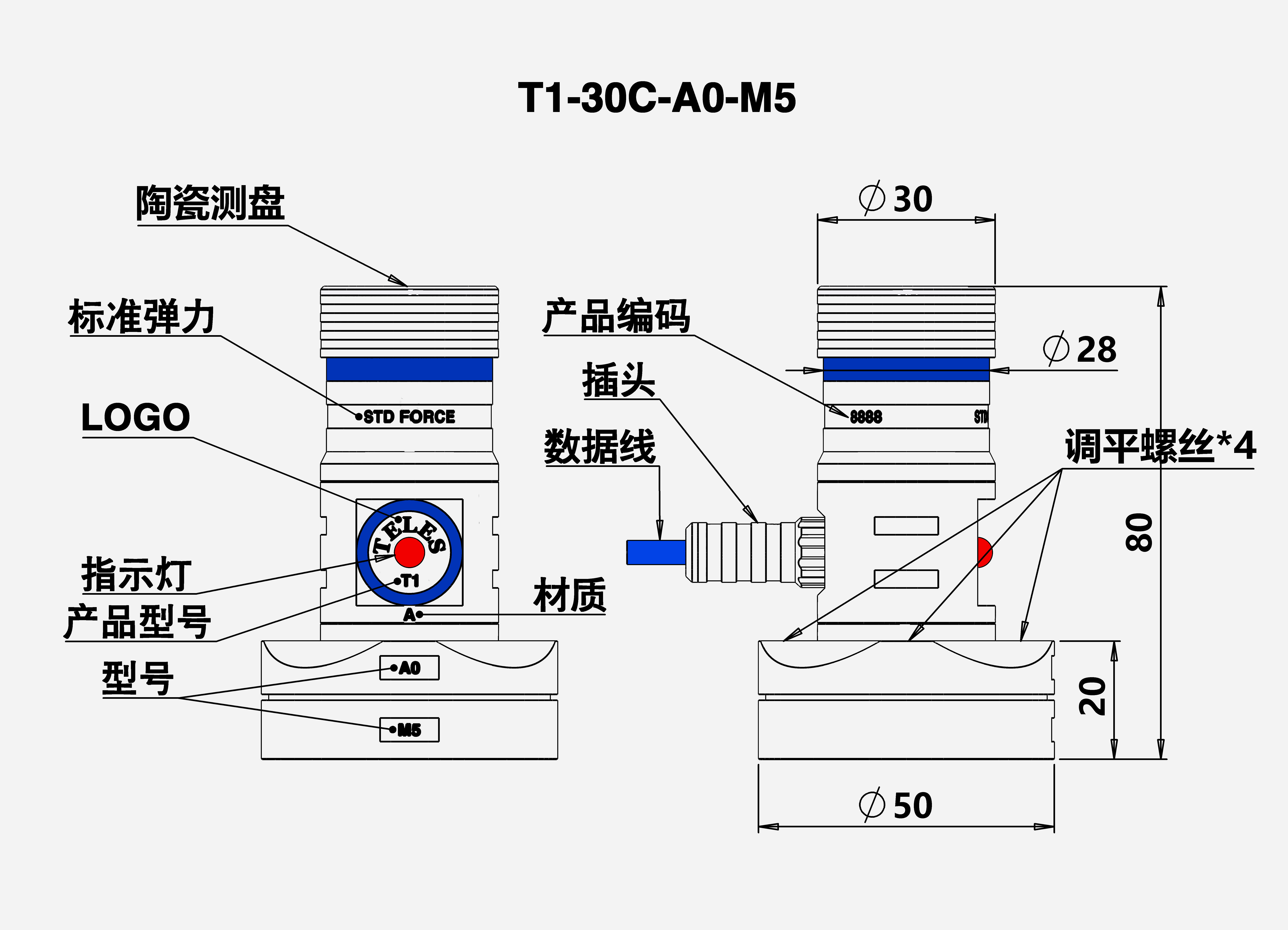1 | T1-30C-A0-M5 | Φ30/50-H80 | 1.00 | 1維 (+Z) | 無 | Φ50-H20 |